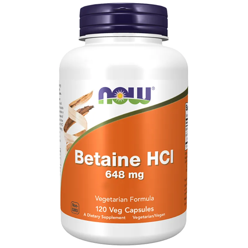 Topkwaliteit Betaine HCI van Now Foods. Per capsule bevat 648 mg Betaïne HCI en 150 mg pepsine.