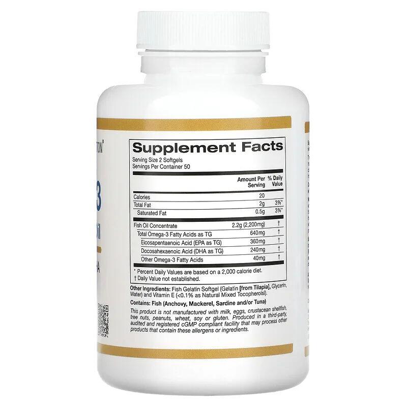 Omega-3 Premium Fish Oil , van California Gold Nutrition ®, is een moleculair gedestilleerde, superkritische extractie met 360 mg EPA en 240 mg DHA per 2000 mg natuurlijk visolieconcentraat.